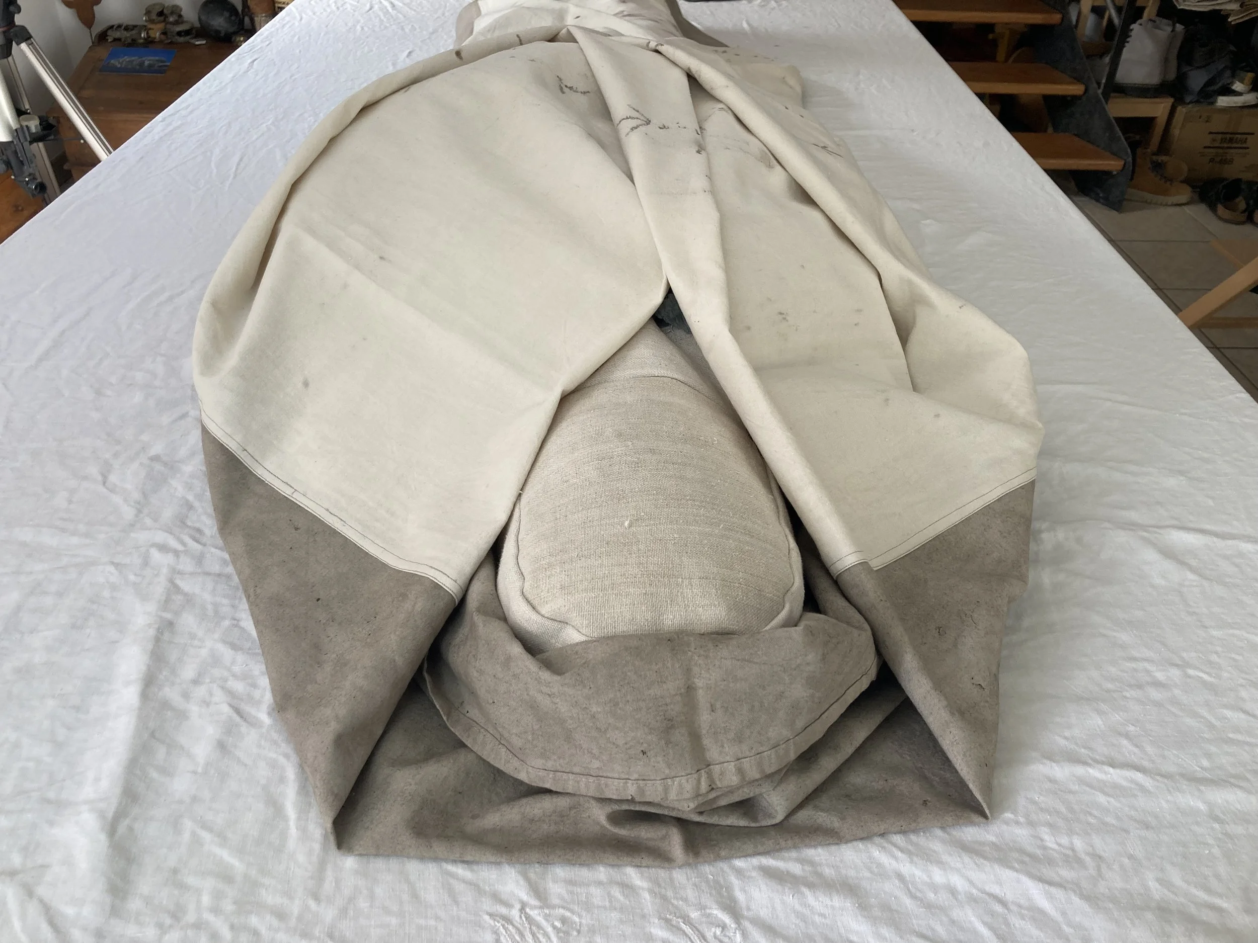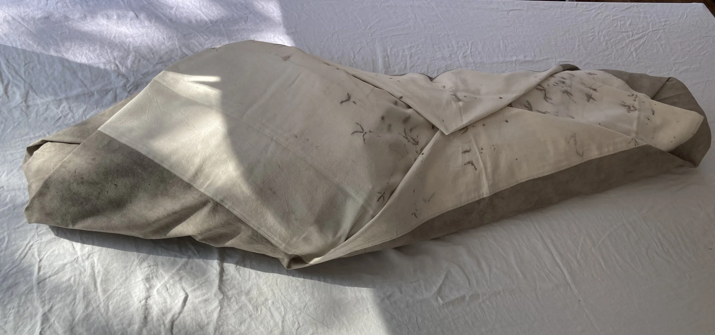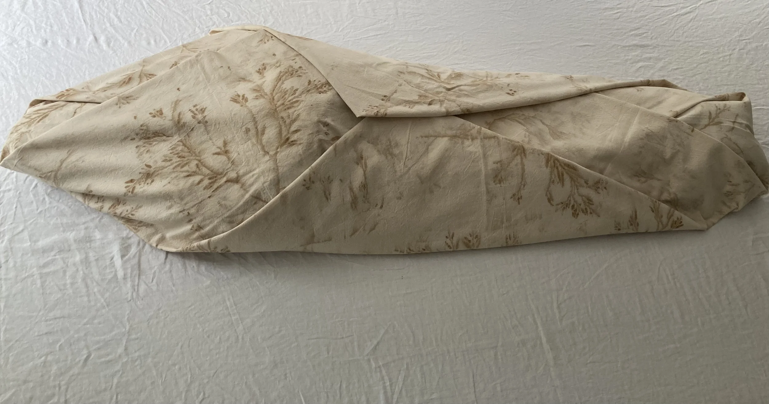 La base des linceuls est fait de draps solides, sortis des armoires de nos anciens. Draps en coton, métisse ou lin. Les teintures et impressions sont faites avec des végétaux, ramassés par ci, par là.