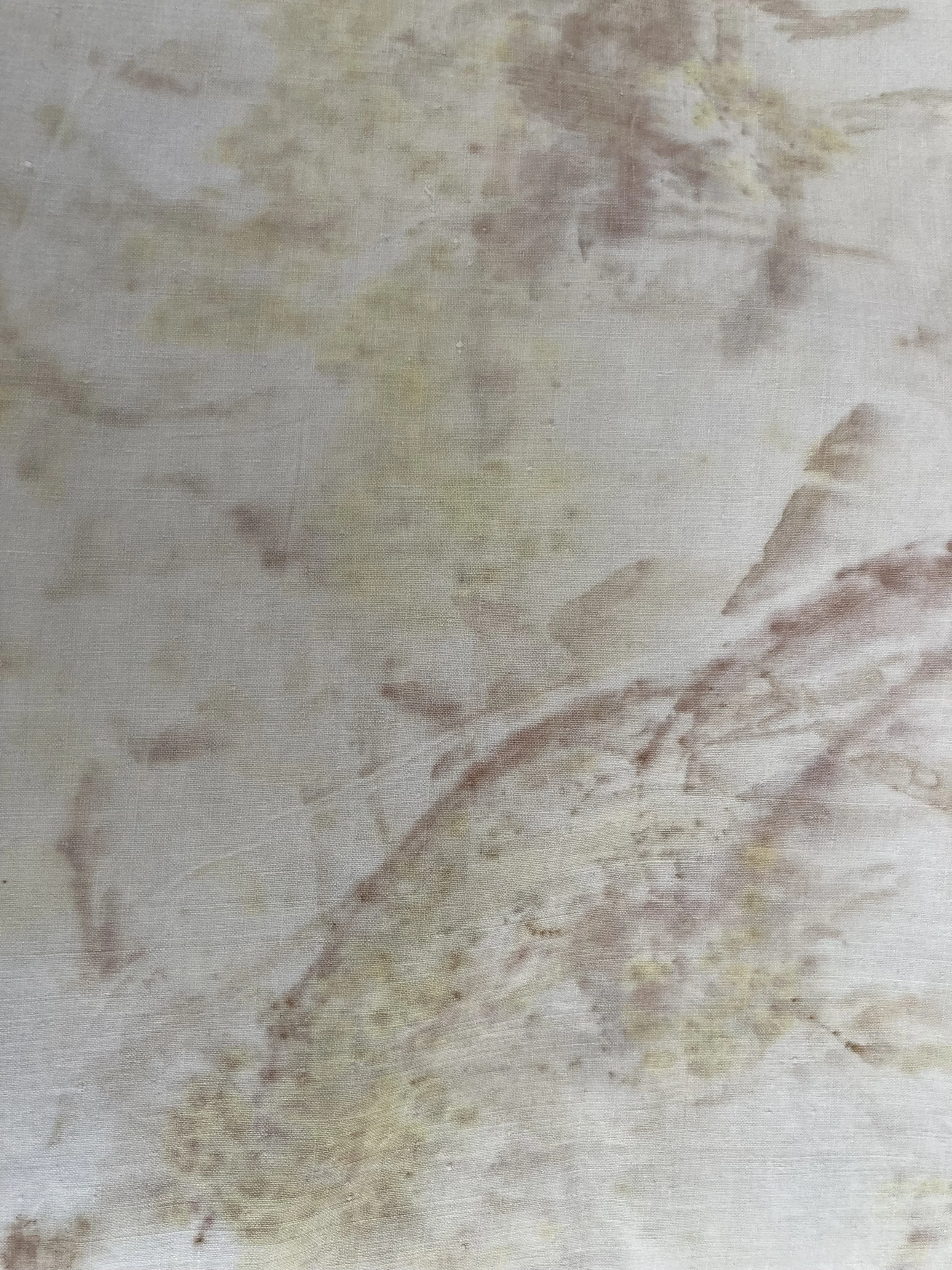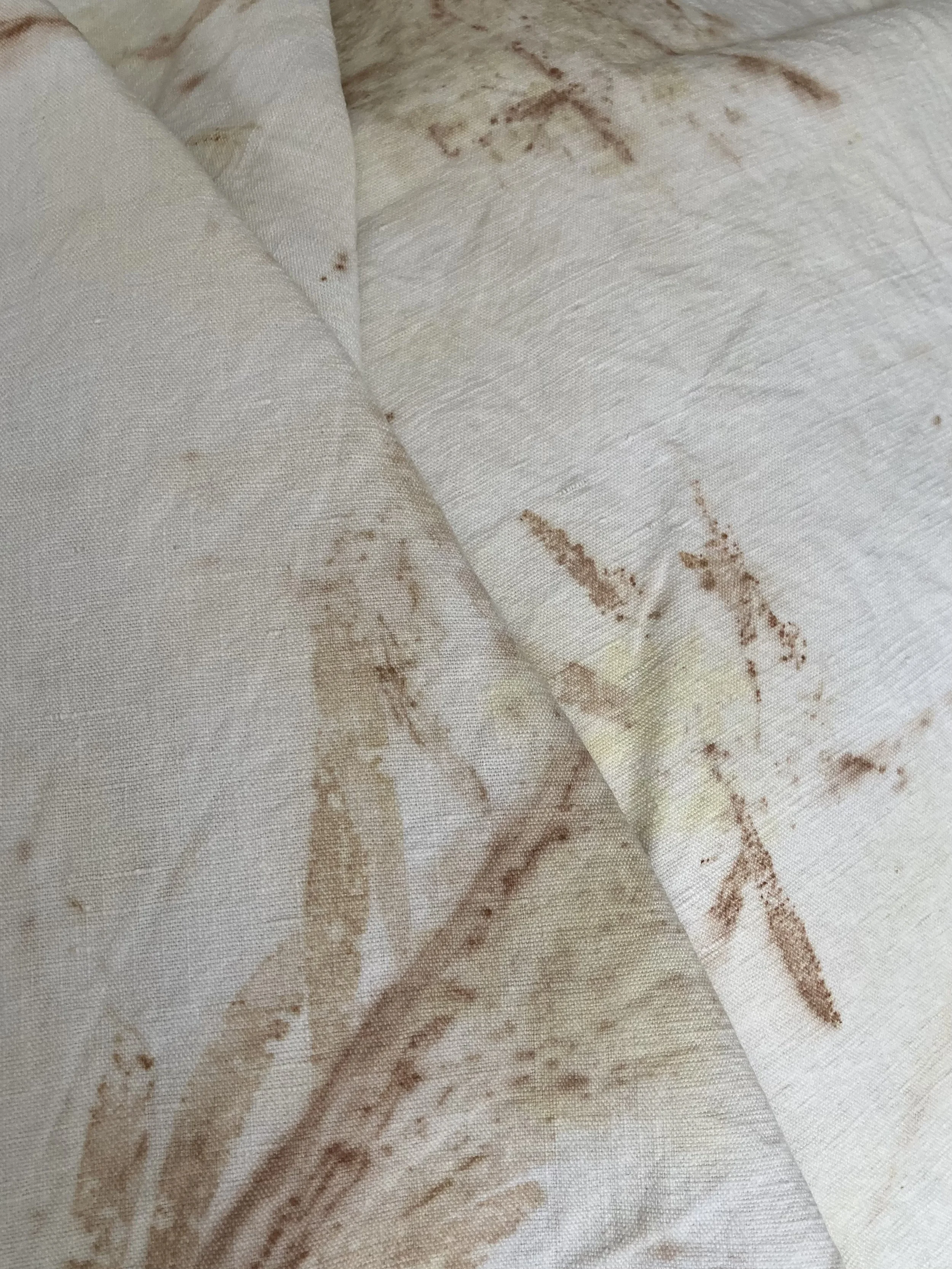 Aidés par le feu et l’eau, les végétaux laissent leurs empreintes sur les draps, ce qu’ils veulent bien nous révéler. Je n’utilise pas d’alun ni aucun sel chimique pour mordancer. L’alun étant, certes, écologique mais non éco-responsable.